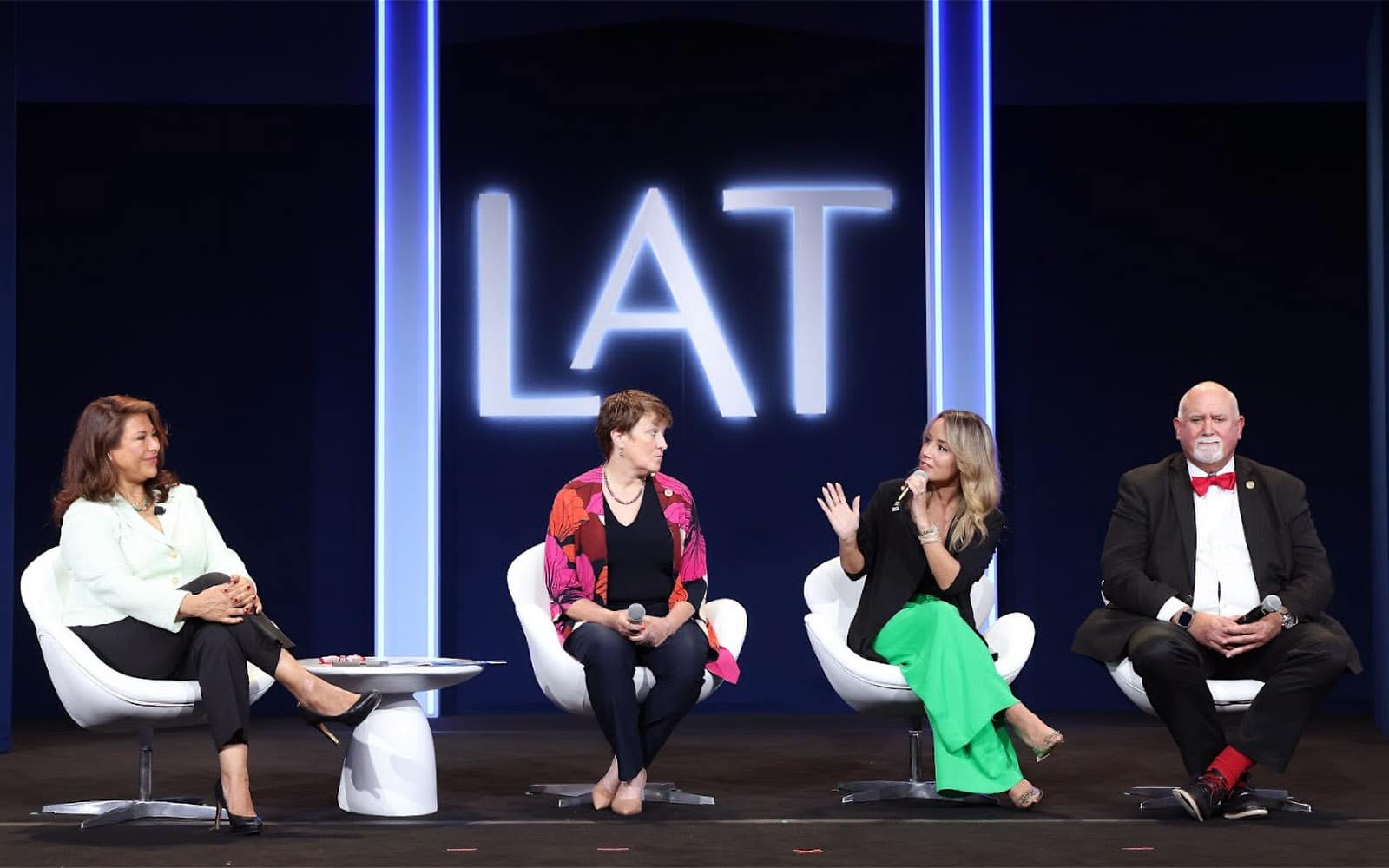 Presenting SHPE’s 2023 Latinos in Engineering & Tech report at L’ATTITUDE. Left to right: Ana Váldez, CEO of the Latino Donor Collaborative; Dr. Kimberly D. Douglas, SHPE’s Chief Research & Impact Officer; Dayna Martinez; and Miguel Alemañy, SHPE’s interim CEO.