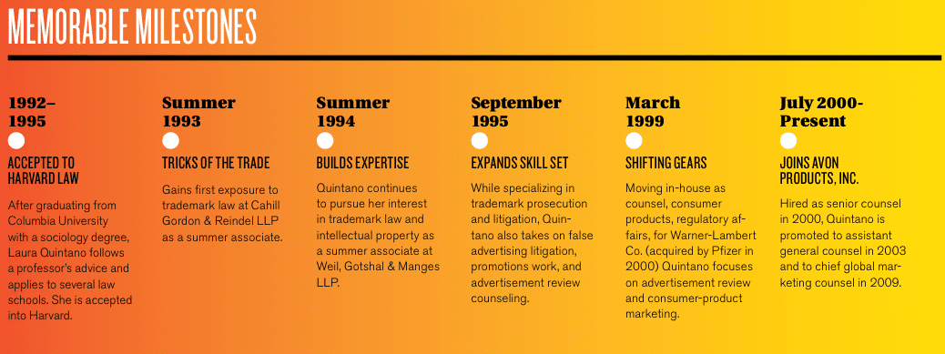 Once practicing, I specialized in trademark law, which is, in part, about protecting brands from infringement. Later, I went to work for a pharmaceutical company, delving into advertising law. From there I landed my position at Avon Products, Inc., the world’s largest direct seller (distributing through independent sales representatives, with Latin America as the top region). Since 2009 I’ve taken on broadened responsibilities in supporting its global marketing business unit and have been fortunate to work alongside a world-class legal team all these years.