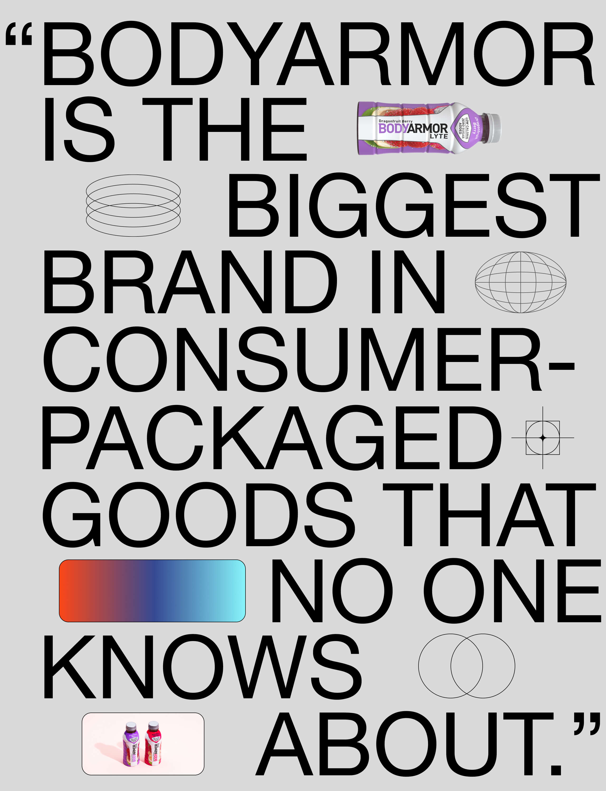“BODYARMOR is the biggest brand in consumer packaged goods [CPG] that no one knows about,” Muyshondt says. “It’s up to my team to tell the story. We have zero artificial sweeteners, flavors, or dyes. We offer superior hydration, we are better for you, and we’re better tasting. Taking on Gatorade may seem like the Red Sox trying to take on the Yankees years ago, but we will win.”