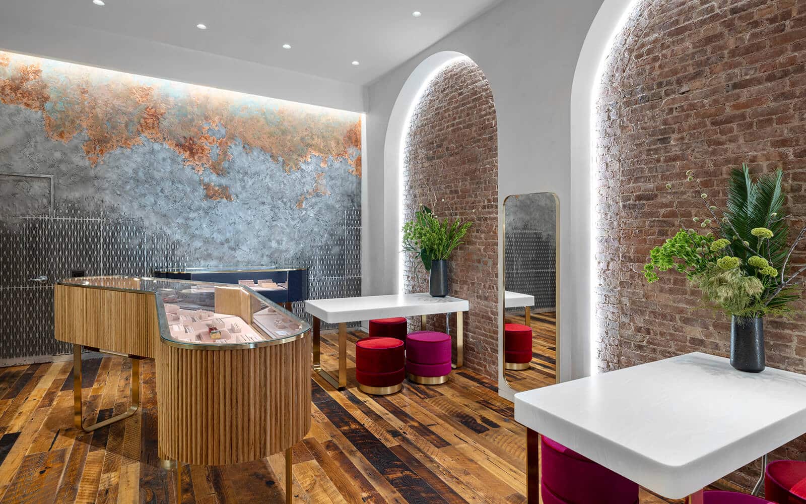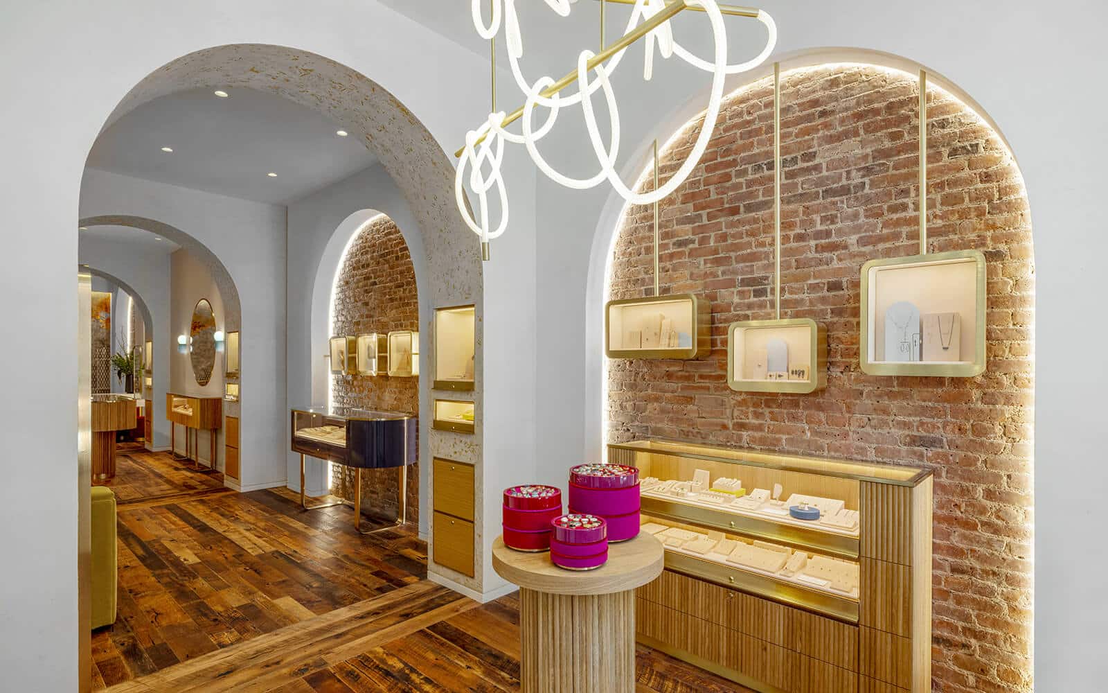 The 1,550-square-foot flagship location in TriBeCa opened in 2022. Around a quarter of the collection is the in-house brand of three jewelry collections and two engagement/wedding collections. The other 75 percent of pieces are curated from more than forty independent brands that are inclusive of Latinx, BIPOC, LGBTQ+ vendors, and from on-site master jewelers that create custom pieces. Latinx brands sold at G.St include emerging designers Rosario Navia, Angely Martinez, and Jam + Rico.