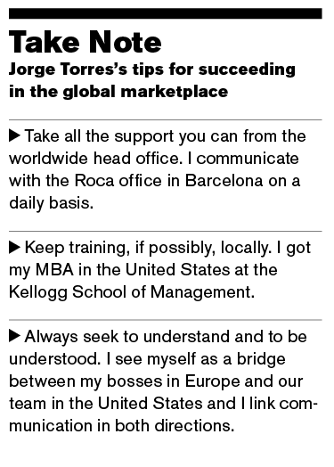 Torres is big on communication, believing that being a good communicator is a key attribute to being a successful CEO, especially one running an international business. Constantly conveying core missions and communicating the direction of the company to your team, customers, suppliers, and stakeholders is a task Torres takes very seriously. Which explains why Torres communicates with the Roca office in Barcelona on a daily basis. “Being able to connect one-on-one to the main office in Barcelona is one of the major advantages of being part of a multinational group,” Torres says. “Connecting to the main office makes me feel like I’m maintaining my support system and keeping it in place. It also keeps the direction clear. From product and financial issues to HR issues, it’s [important]to stay in sync.”