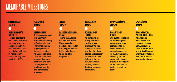 One of the country’s most recognizable vehicles is a U-Haul truck. White with an iconic orange cummerbund, it’s a mascot of the American roadway. While everyone knows its trucks, what few people realize about U-Haul International is that a husband and wife started it in a garage in 1945 with only $5,000 in savings—an entrepreneurial origin that makes it a perfect fit for Thomas “Tom” Felíx Tollison, senior assistant general counsel for U-Haul’s marketing group. “I come from a background of entrepreneurs,” says Tollison, who was born in Albuquerque, New Mexico, in 1968. “My family emigrated here from northern Spain. They weren’t doctors or lawyers, so they started their own businesses. For example, my grandfather had a grocery store, and at one time he had a restaurant and a roller-skating rink.”