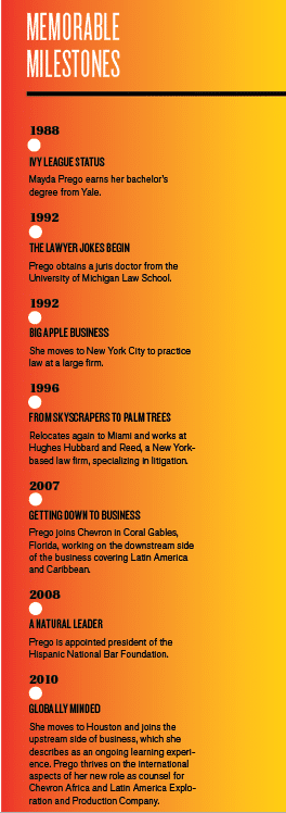 Prior to focusing on energy law, Prego—who was born and raised in Manhattan by a Cuban father and Puerto Rican mother—worked in Miami as an attorney for New York-based firm, Hughes Hubbard and Reed, where she became experienced in complex civil and criminal litigation as well as international litigation and arbitration. “Before Chevron, I was a litigator,” Prego explains. “I joined Chevron’s in-house legal department because I wanted to expand my skills as an attorney by getting closer to the business and the business decision makers. Having the ability to work hand in hand with your business clients is one of the main differences from private practice. When I first joined Chevron, I continued to work on important litigation matters as I had in private practice, but then also expanded my practice into corporate, labor, and transactional matters for the countries within my portfolio, giving me the opportunity to stretch my legal skills in a whole new direction.”