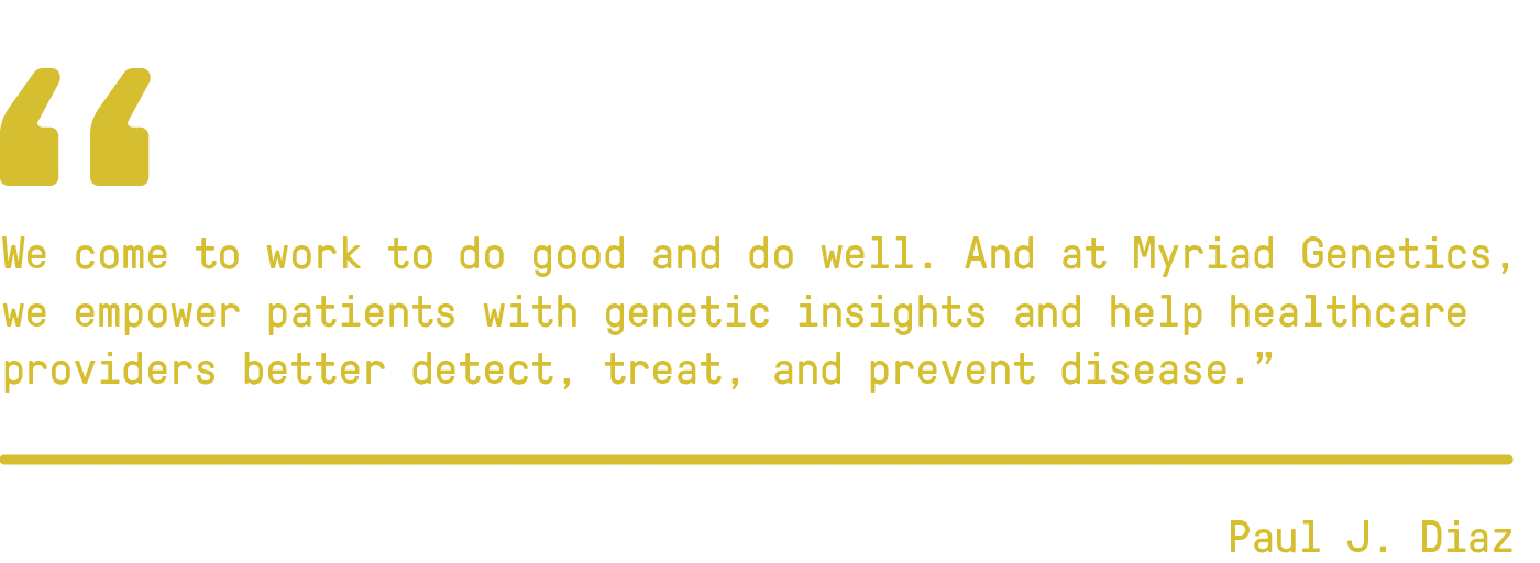 “One of our biggest advantages is our 2,300 dedicated teammates who are patient- and mission-focused,” Diaz says. “We come to work to do good and to do well. And at Myriad Genetics, we empower patients with vital genetic insights and help healthcare providers better detect, treat, and prevent disease. It’s meaningful and it matters.