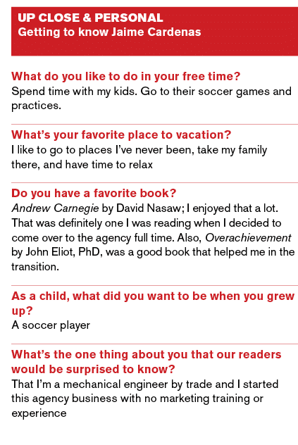 Jaime Cardenas was a mechanical engineer in Mexico working at the Hanes division of Sara Lee when he relocated to the United States. While in North Carolina, he decided to broaden his skills and his future by attending the MBA program at Wake Forest University. It was there that he took an entrepreneurship course and was challenged with starting a real business. With no marketing experience at all, he and Alfredo Amparan Garza founded AC&M Group, a strategic marketing agency with a focus on soccer and other sports.