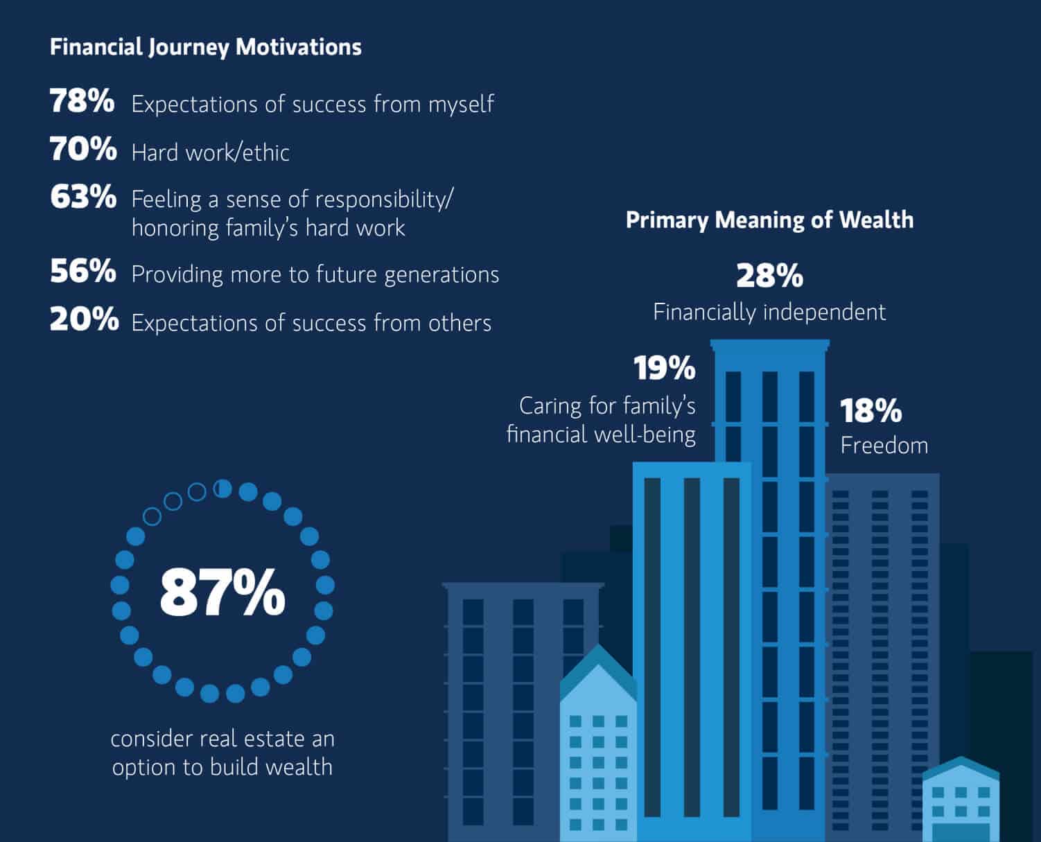 Hispanics/Latinos have increased their wealth year over year since 2019, and they are seeking to invest their future now to build multigenerational wealth sooner rather than later. Wealth can provide financial independence and helps create the freedom and stability to care for their family’s well-being.