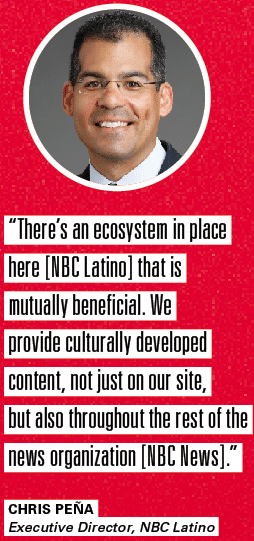 Chris Peña, executive director of NBC Latino describes the news outlet as a digital start-up within a legacy media company, the function of term he calls “interim entrepreneurship.” He adds, “There’s an ecosystem in place here that is mutually beneficial. We provide culturally developed content, not just on our site, but also throughout the rest of the news organization [NBC News].”