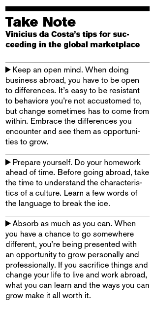 Despite his success, da Costa is still working to combat some deep-seated cultural differences. “As Latinos we’re taught to be very humble about our capabilities and our accomplishments, but in the United States I’m learning that you have to be more assertive,” he says. “If you’re coming here from another country, don’t be afraid of standing out because your education or life experiences are different from your coworkers. Make use of what makes you different.”